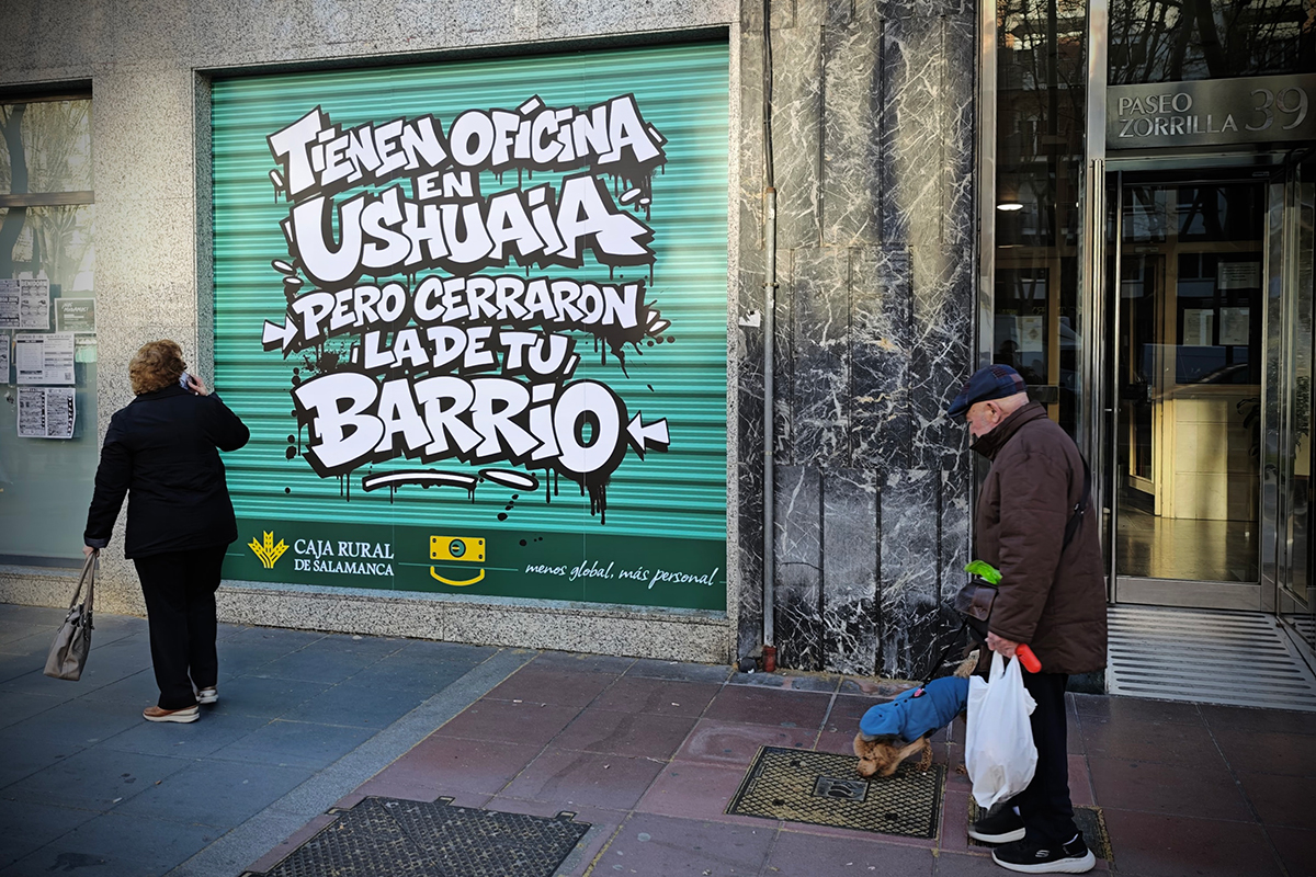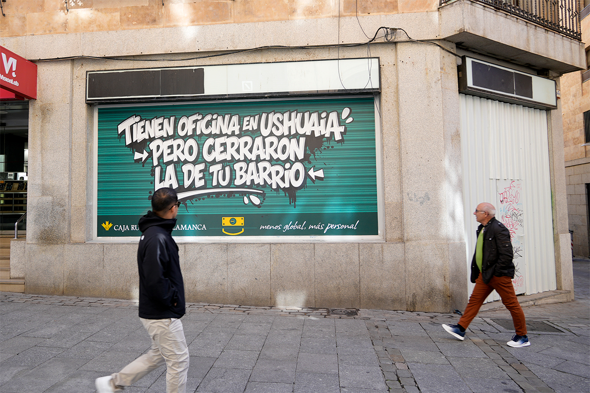Uno de los ejes creativos se apoya en un mensaje especialmente rotundo: “Tienen oficina en Ushuaia pero cerraron la de tu barrio”. La frase resume con claridad el contraste entre los grandes relatos de globalidad (oficinas en las principales capitales del mundo, plataformas digitales de alcance planetario…) y el cierre masivo de oficinas. Según datos del Banco de España, nuestro país ha perdido más de la mitad de sus sucursales bancarias en apenas una década, dejando a numerosas comunidades sin acceso físico a servicios financieros esenciales.